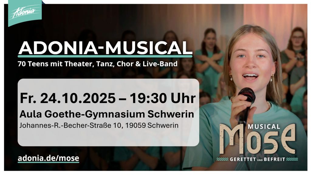 Herzliche Einladung zum Adonia-Musical „Mose – gerettet und befreit“. 70 Teens in einem Chor, eine großartige Live-Band, Theater, Tanz und Solisten – alles was es für ein Musical braucht. Ein unvergesslicher Musicalabend mit einer Mischung aus Dramatik, Humor und Tiefe. Kommt vorbei und bringt Freunde mit.